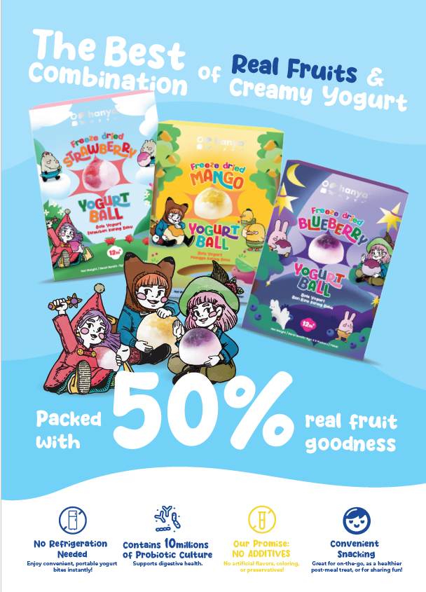 Yogurt Ball ingredients : Strawberry / Bluebbery/ Mango (50%), Yogurt (24%), Trehalose, Full fat milk pwder, Maltoxdextrin, Starch, Bifidobacterium subsp. Lactis HN019 (Addition amount not less than 1 *106 CFU/g)