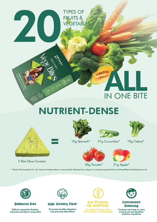 Vege Bites Ingredients : Mixed Vegetable juice (Cucumber, Shanghai greens, lettuce, Chinese cabbage, water spinach, broccoli, spinach, cabbage, kale, lettuce, carrot, tomato, pumpkin, sweet potato, cauliflower, corn, yam)(≥54%)、Cheese sauce、Cantaloupe juice、Pear pulp concentrate、Resistant dextrin、Instant oatmeal、Quinoa crisps、Barley sprout powder、Brussel sprout powder、Kale powder、Yamabushitake、Poria cocos powder、Gordon seed powder.